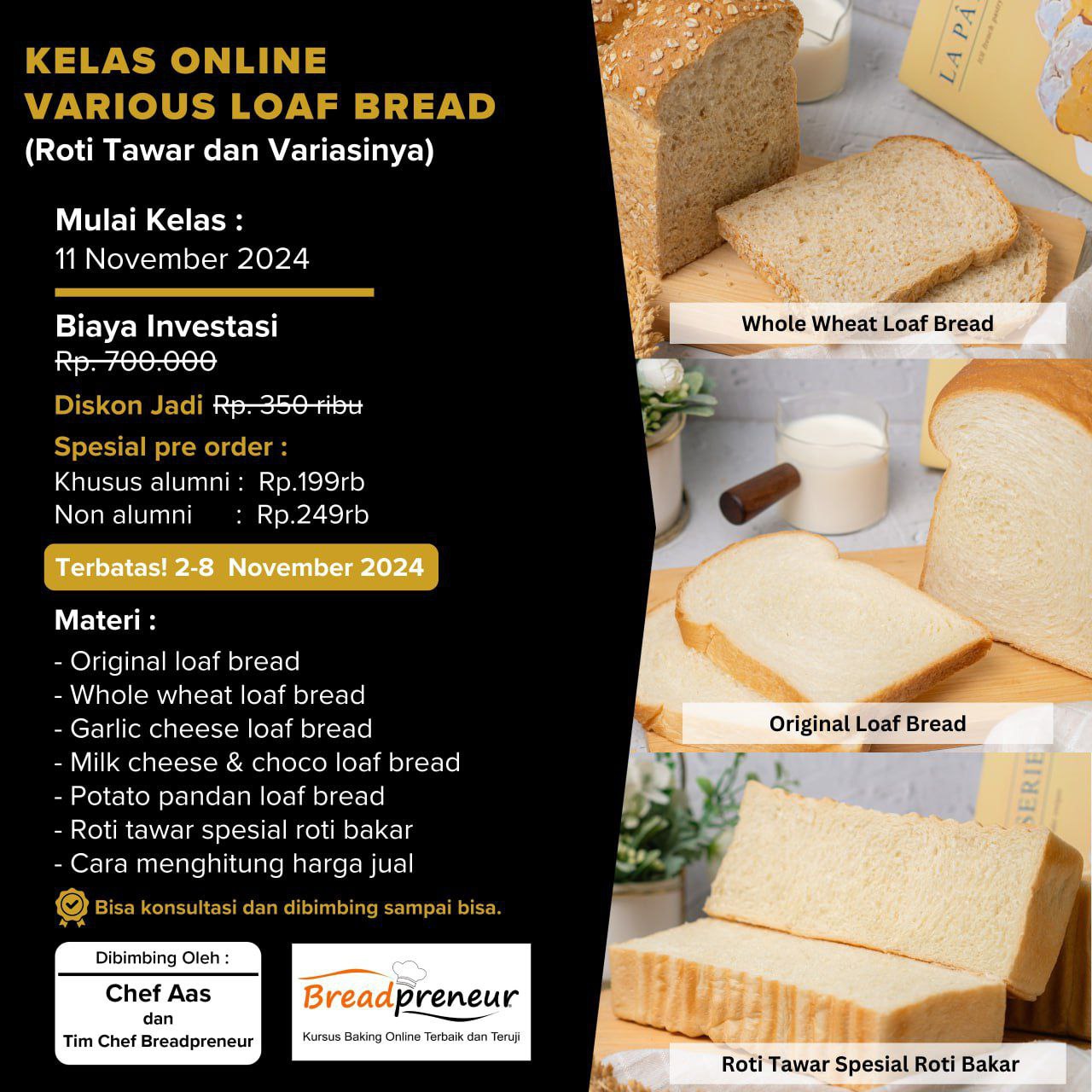 Di kelas ini kamu bakalan dibimbing oleh Chef Breadpreneur sampai bisa bikin.